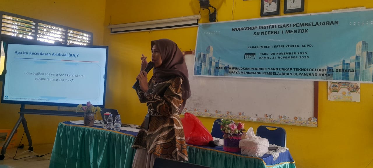 Kegiatan workshop yang diselenggarakan oleh SDN 1 Mentok kali ini mengambil tema Pembelajaran Mendalam “Deep Learning”. Dimana narasumbernya adalah ibu Eftri Yenita, M.Pd.  Workshop dilaksanakan selama dua hari dari tanggal 26-27 november 2025. Dalam kegiatan ini, kami mengundang Ibu Tini Suryati, S.Pd selaku pengawas sekolah, pak Henky Wibaya, M.Pd selaku Kabid GTK Dikpora Bangka Barat sekaligus yang membuka kegiatan workshop kali ini.